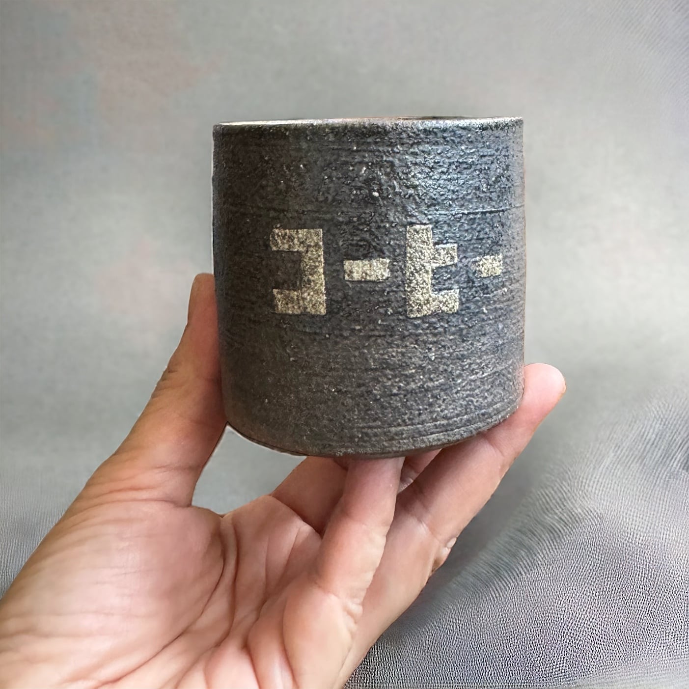 ブランド 森脇 要 クスッと笑えるシリーズ陶器 軽く使いやすいフリーカップ 後ろと前は ひらがなとカタカナでちがいます 口径7.5cm 高さ7cm ハンドメイドなのでお色や文字が少しずつ違ってきます。 釉薬の具合でも違ってきます。 こちらで選んで発送させて頂きますので味と思って下さい。