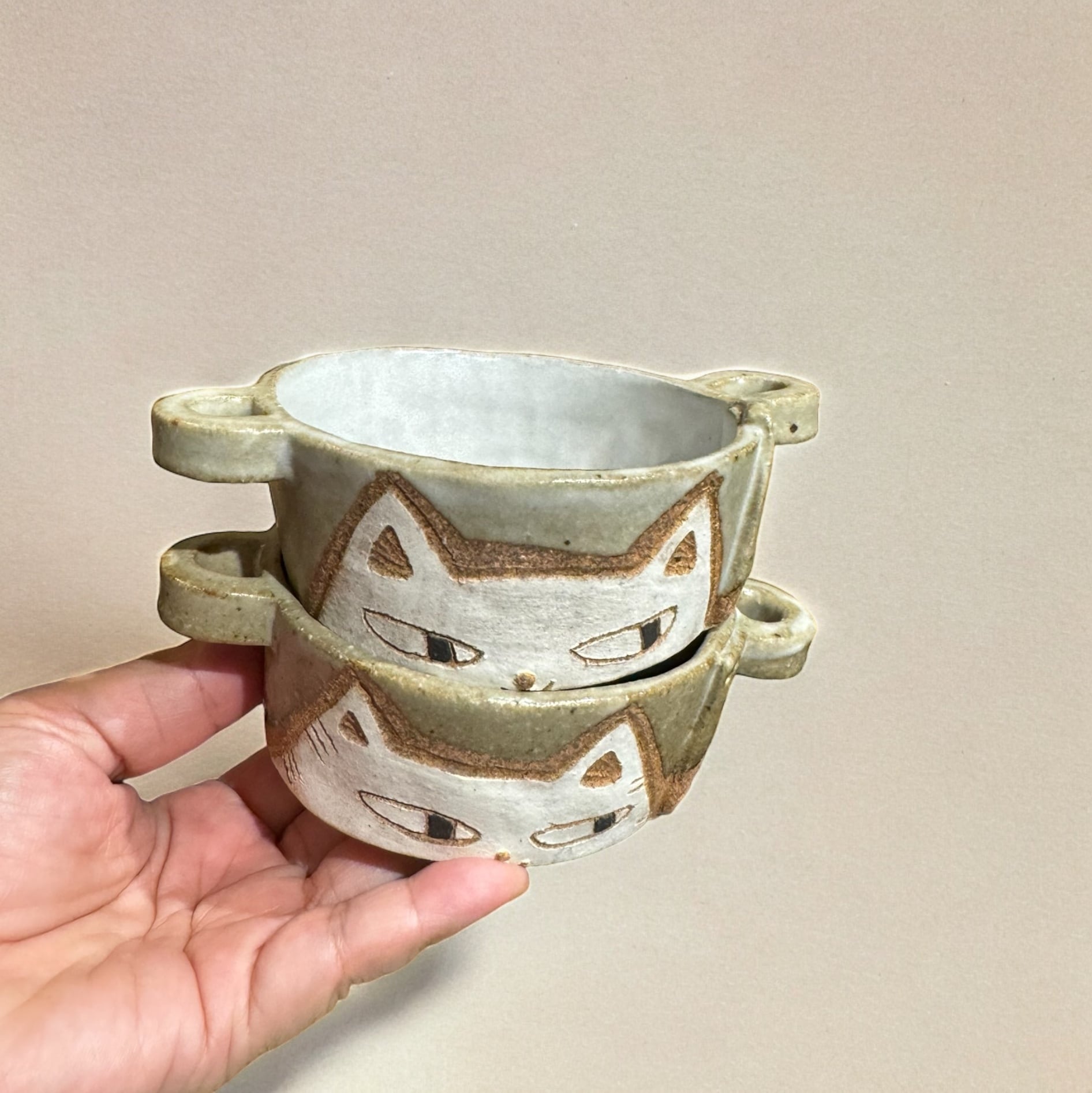 ブランド 小谷文代 信楽焼 味のある猫の耳付き深皿 底には足の足跡 前にはお顔 後はしっぽになってます 焼きむらや形 若干のサイズが個々でちがいます ハンドメイドの味と思って下さると幸いです 最後の画像のお顔になります 耳含む口径13cm 高さ4cm