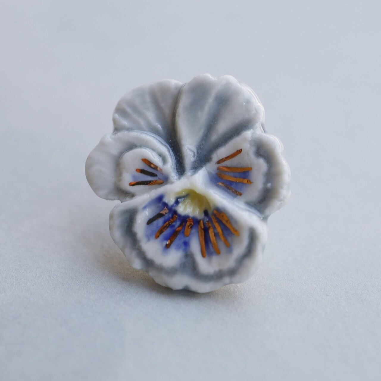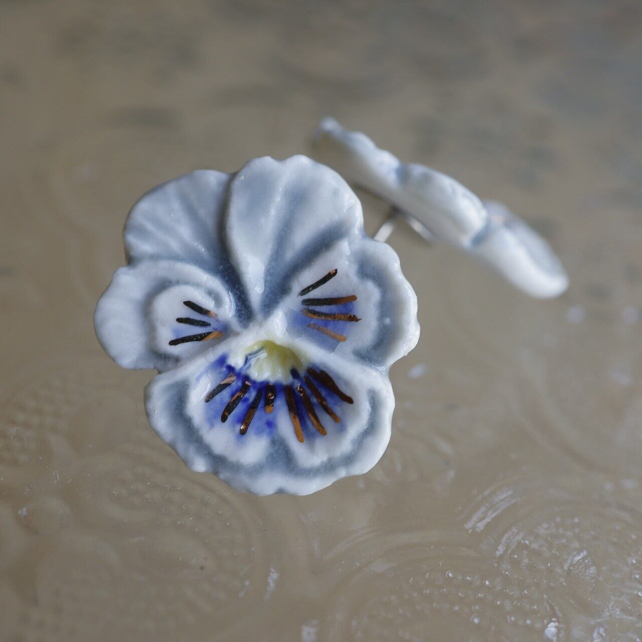 パンジーをモチーフにした陶器のピアスです。花びらの模様が丁寧に手書きで描かれています。パンジー特有の愛らしいお花の形を手で一つずつ粘土を薄く延ばすことで繊細に表現しています。