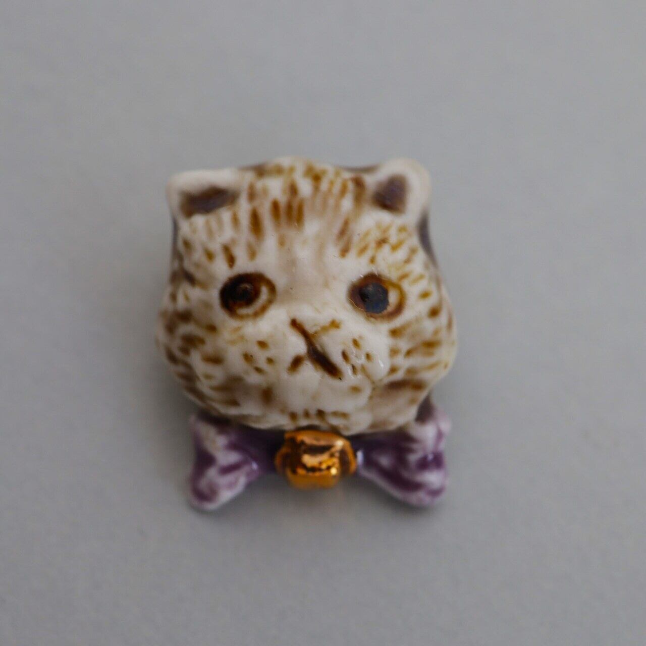 蝶ネクタイをしておしゃれをしている白ねこのブローチです。毛並みは一本一本針で彫られていてうっすら灰色みを帯びています。何とも言えない愛くるしい表情をしたかわいいねこちゃんです。リボンの真ん中には金彩が施されています。