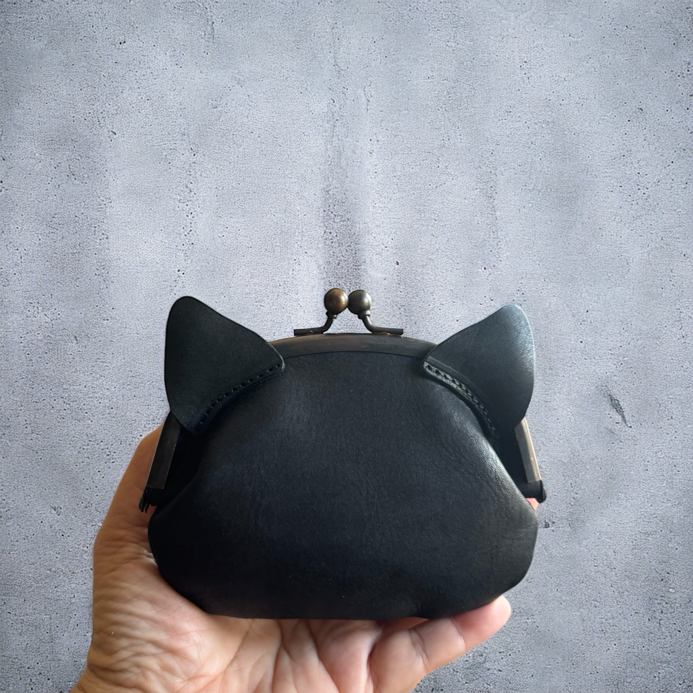 ブランド 雨ザラシ工房 群馬県に工房をかまえる雨ザラシさん作品 ねこの顔が可愛いがま口 とても しっかり作られてます 使い込んで味が出てくる本革 ブラック カン付きなので 革紐つけてバックにつけたり 紐をつけて首から下げても可愛いです 紐はついてません 横12cm 高さ10cm まち5cm