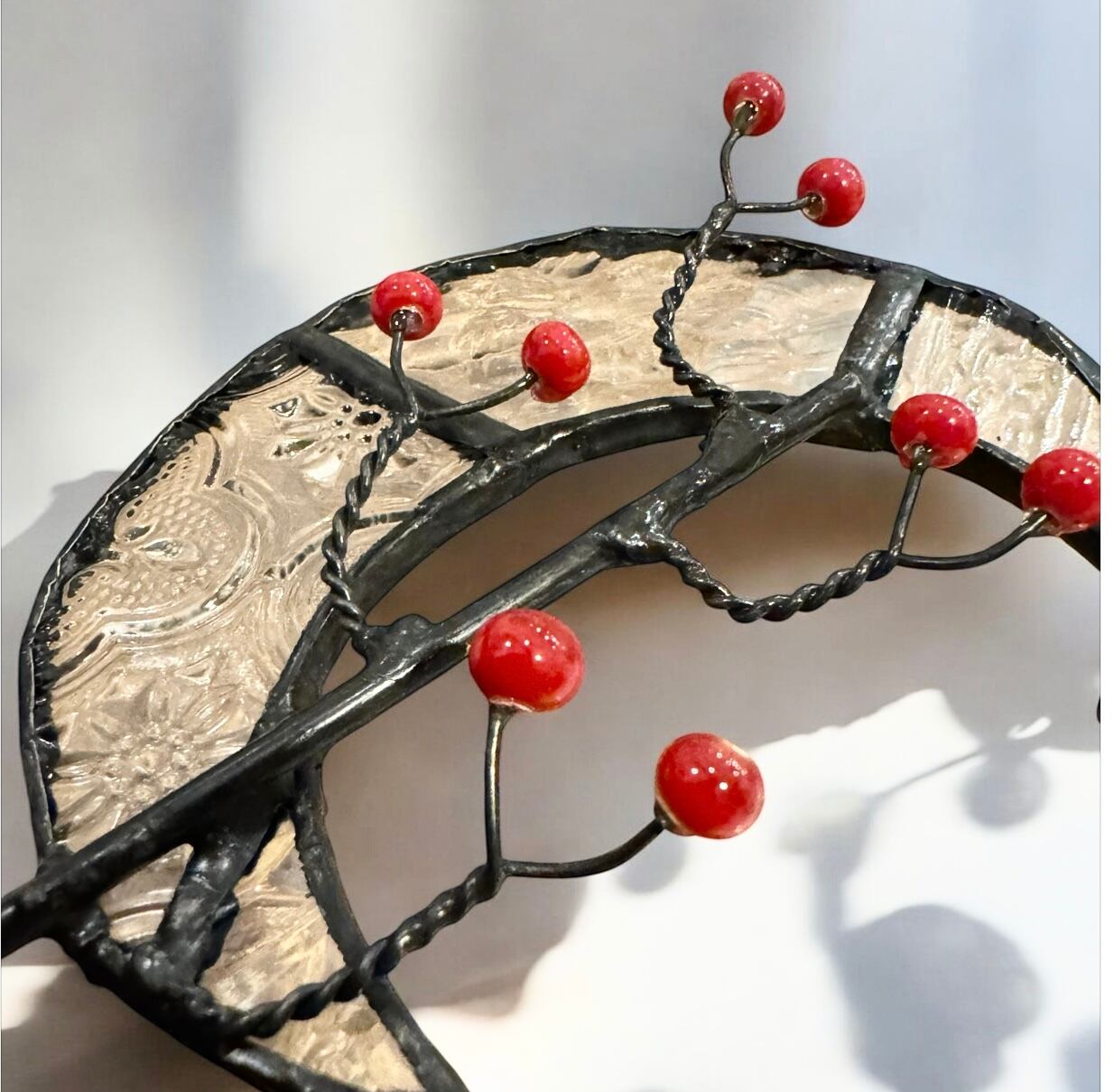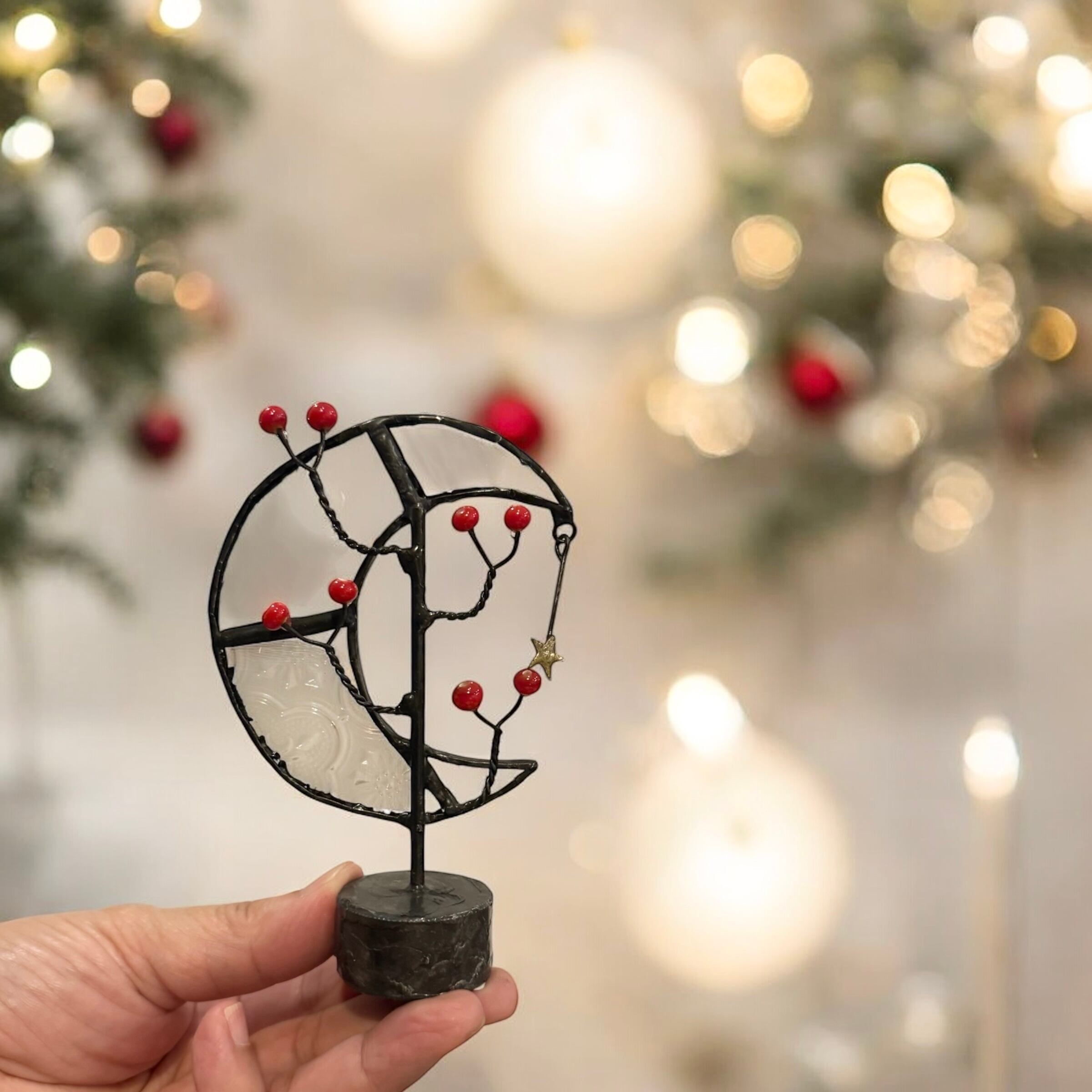 ブランド ガラス雑貨作家 Vetro 月の先端のゴールド星はゆらゆらゆれます 鉄とステンドグラスオブジェ ハンドメイド 横8cm 高さ11.5cm